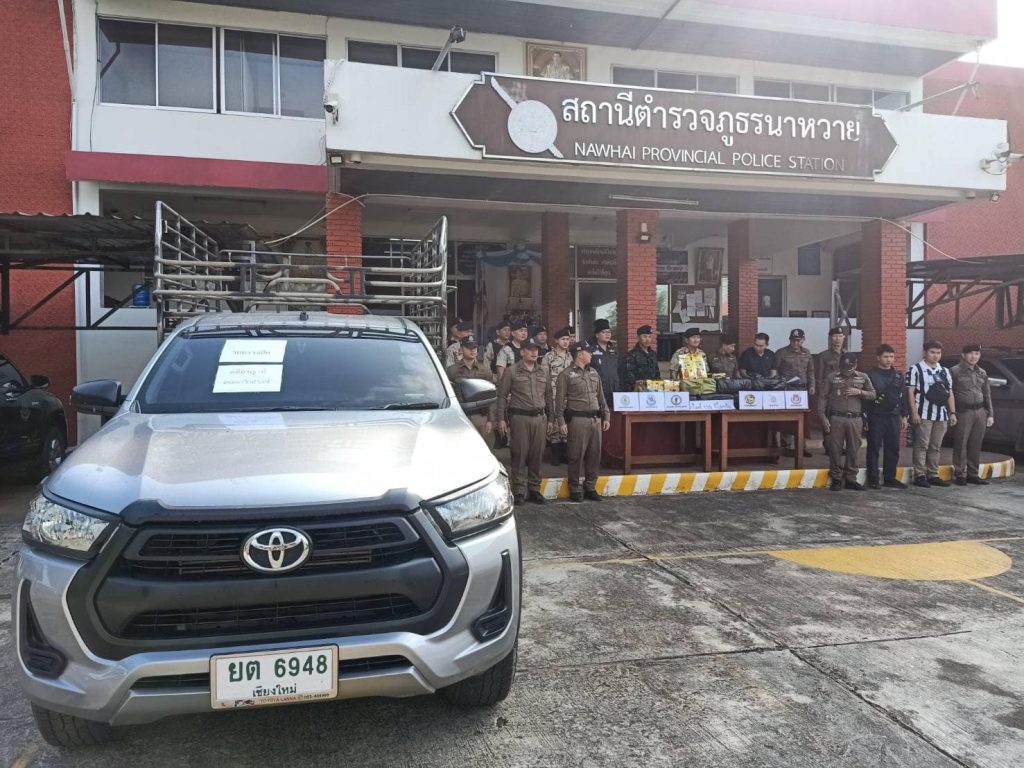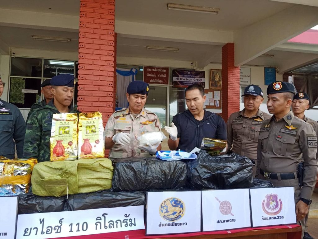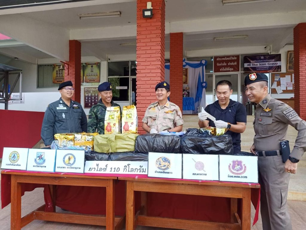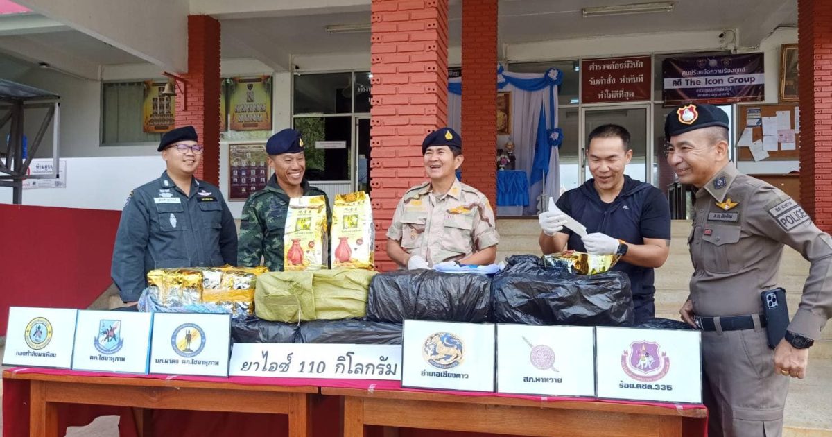 วันนี้ 18 พ.ย.67 เวลา 09.00 น. โดยการอำนวยการของ พ.ต.อ.ประดิษฐ์ ติ๊บมา ผกก.สภ.นาหวาย ข้าราชการตำรวจ สภ. นาหวาย,นายอำเภอเชียงดาว,ร้อย ตชด. 335, กองกำลังผาเมือง ,ฉก.ไชยานุภาพ,บก.ผาดง ฉก.ไชยานุภาพ ร่วมแถลงการตรวจยึดยาเสพติดให้โทษประเภท 1 (ยาไอซ์) จำนวน 9 กระสอบ รวมน้ำหนักประมาณ 110 กิโลกรัม จึงได้ตรวจยึดยาเสพติดและ รถยนต์ของกลางดังกล่าวไปยัง สภ.นาหวาย ส่งมอบพนักงานสอบสวนเพื่อดำเนินการตามกฎหมายต่อไป
