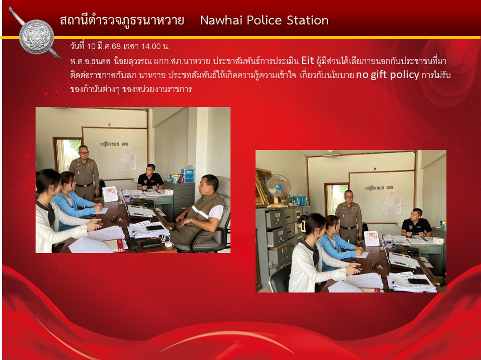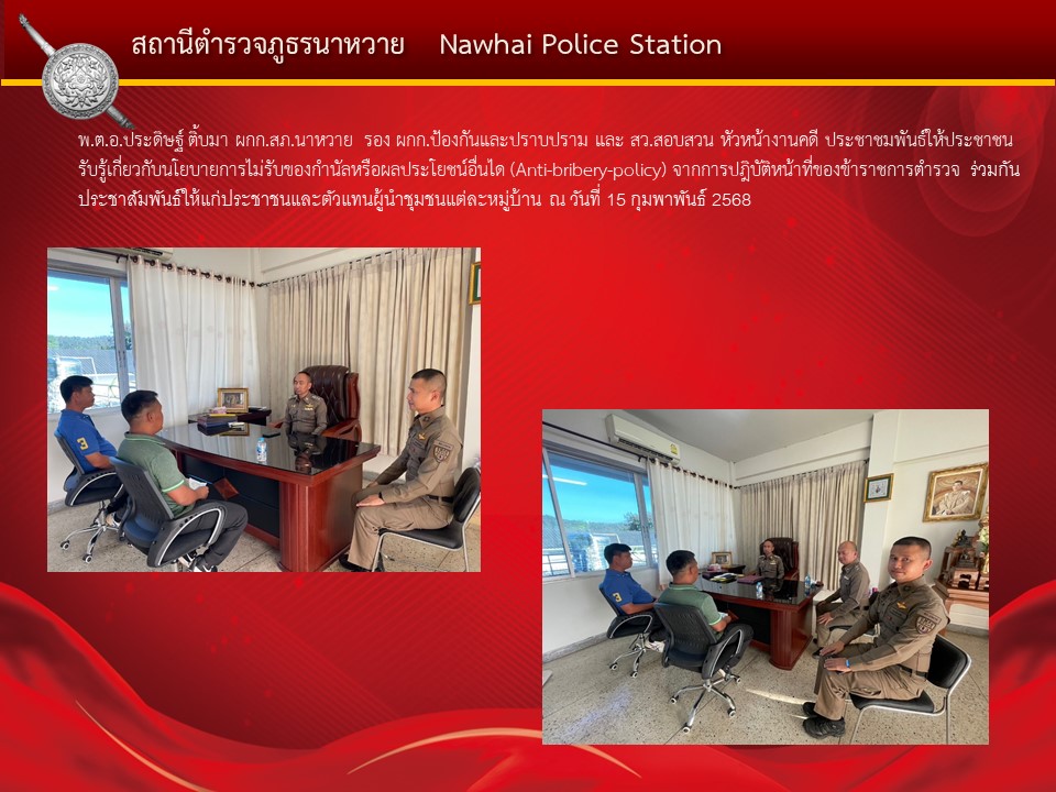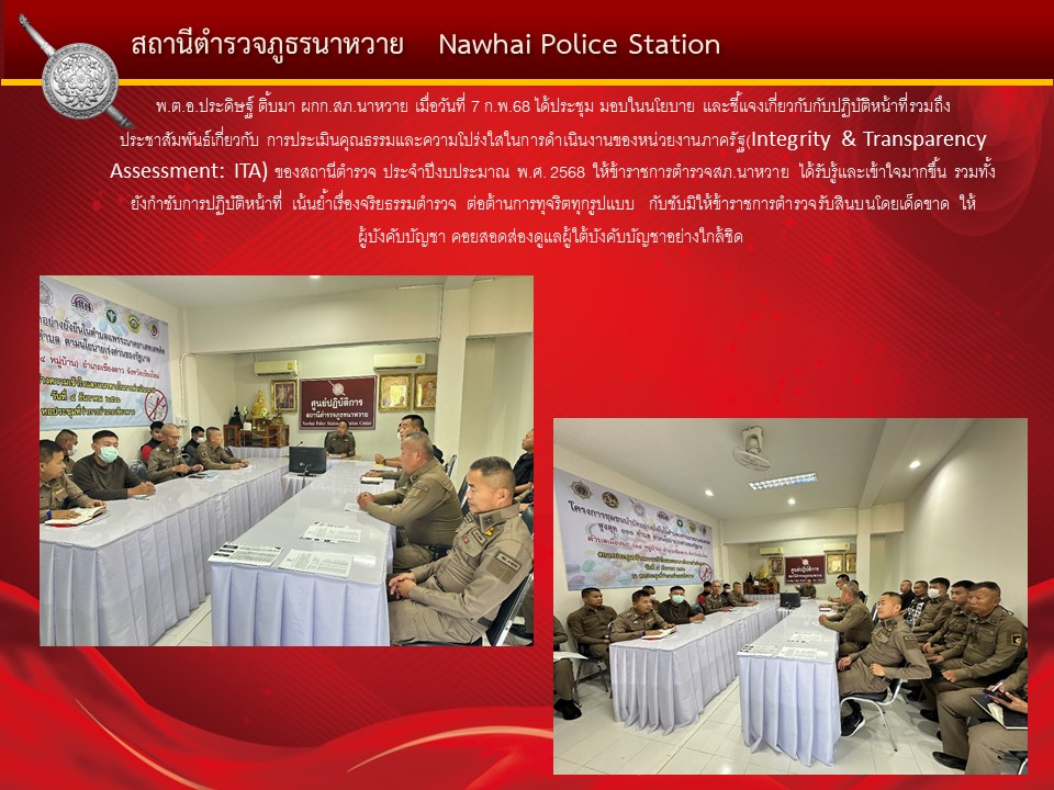 Home » มาตรฐาน ITA » ตัวชี้วัดที่ 10 การป้องกันการทุจริต » ตัวชี้วัดย่อยที่ 10.1 การดำเนินการเพื่อป้องกันการทุจริต » ประกาศนโยบาย » O19 การมีส่วนร่วมของหัวหน้าสถานีตำรวจ